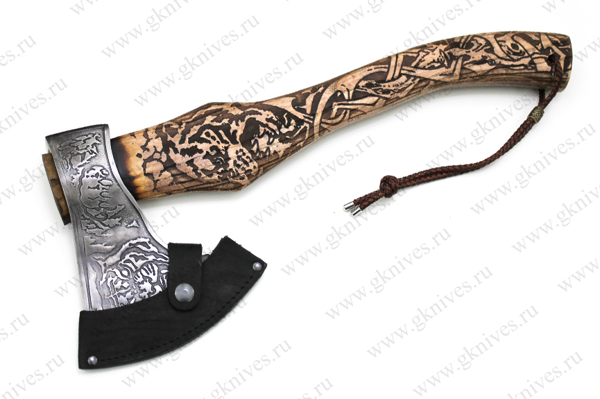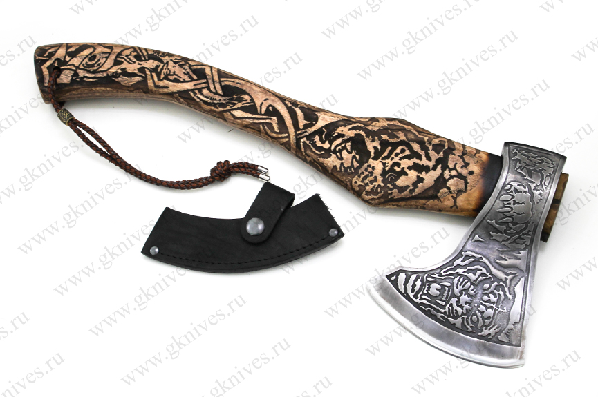 Топор изготовленный из стали 65Г. Рукоять (топорище) из ценных пород древесины. Ножны изготовлены из натуральной кожи. Незаменимый помощник в быту, на природе, в походе. Хорошее приобретение для людей любящих активный отдых.