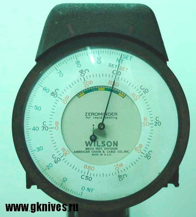 Шкала Рокуэлла С используется для измерения твердости различных марок стали для ножевых изделий. Острая алмазная грань вдавливается в стальную заготовку под небольшим давлением, затем давление увеличивается и в конце снова уменьшается. Различная глубина надрезов измеряется, и полученные в результате расчеты сравниваются со шкалой Рокуэлла. Разнообразие сталей начинается со значения 50 по Рокуэллу, которое повышается и достигает 60 для лучших и самых прочных сталей. Данная шкала скорее нужна для производителей ножей, чем для пользователей. Если ваш личный нож соответствует обычным нормам твердости, то вам не о чем беспокоиться.