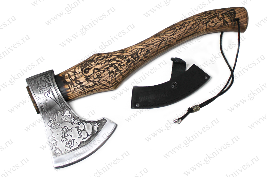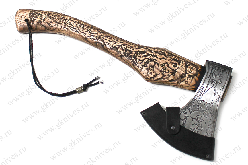 Топор изготовленный из стали 65Г. Рукоять (топорище) из ценных пород древесины. Ножны изготовлены из натуральной кожи. Незаменимый помощник в быту, на природе, в походе. Хорошее приобретение для людей любящих активный отдых.